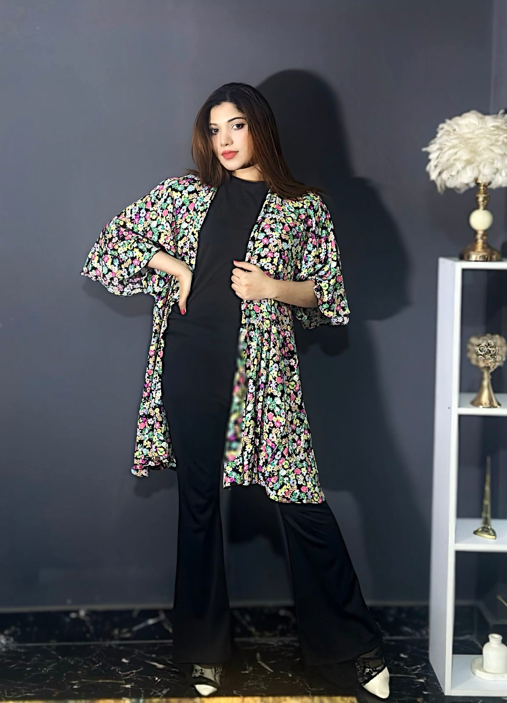 Step into a world of color with beautiful shrug! Perfect for adding a vibrant twist to your everyday look, this lightweight floral layer is a must-have. Style it with a black turtleneck and wide leg pants for a chic casual vibe or pair it with a white tank and denim pant for a breezy beach look—versatility never looked this good!