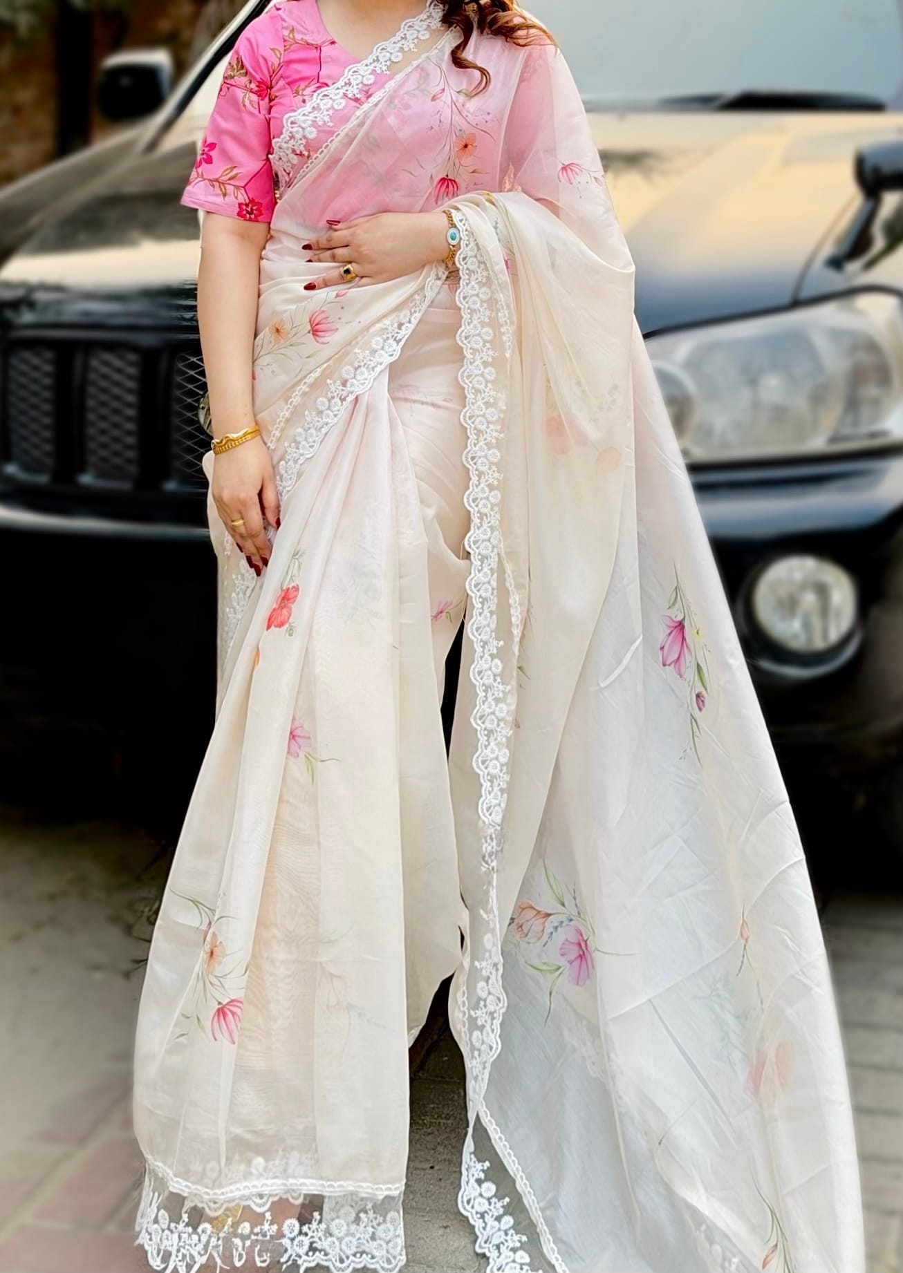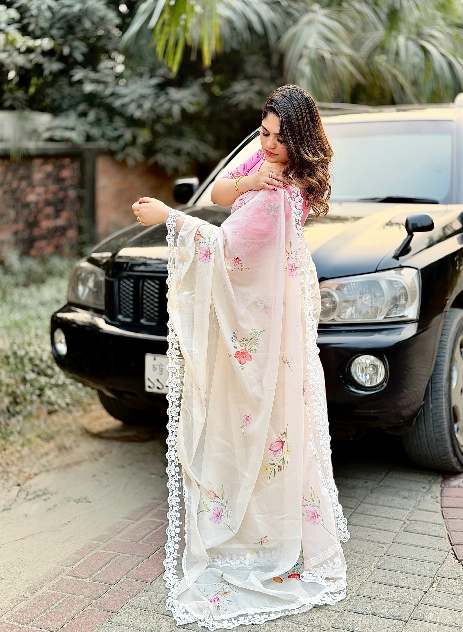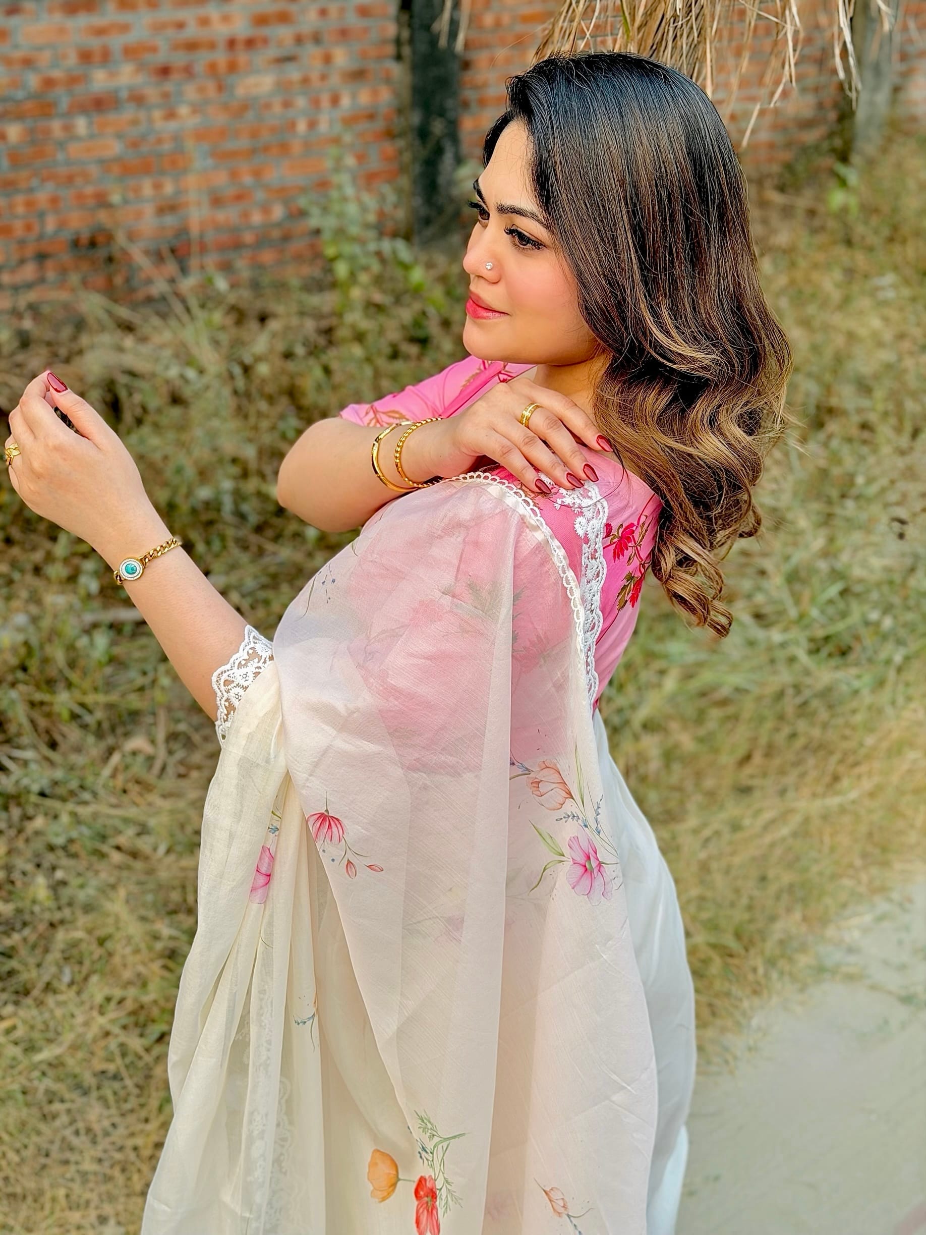 Our first saree drop features soft florals, lace detailing, and a matching contrast blouse piece included — made to be loved.