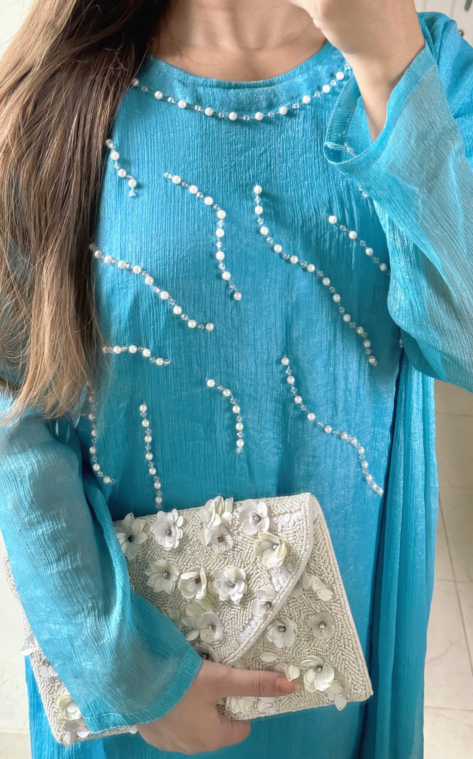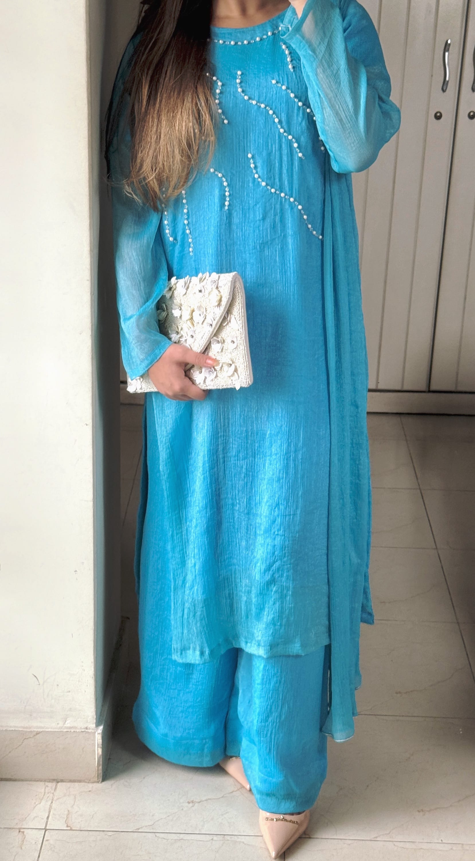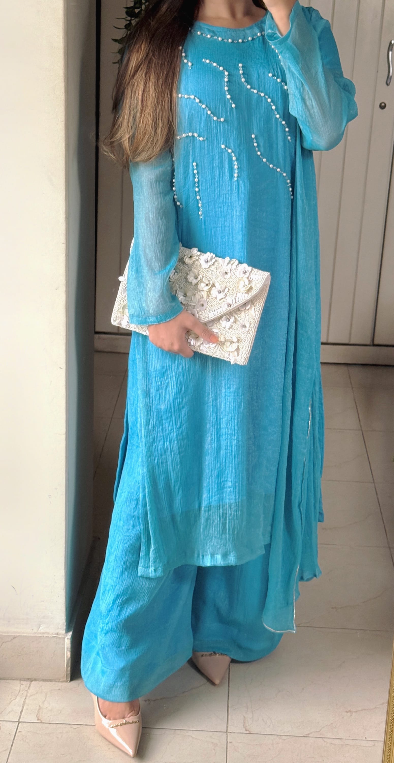 •Material: Soft shimmer chiffon (inner attached)