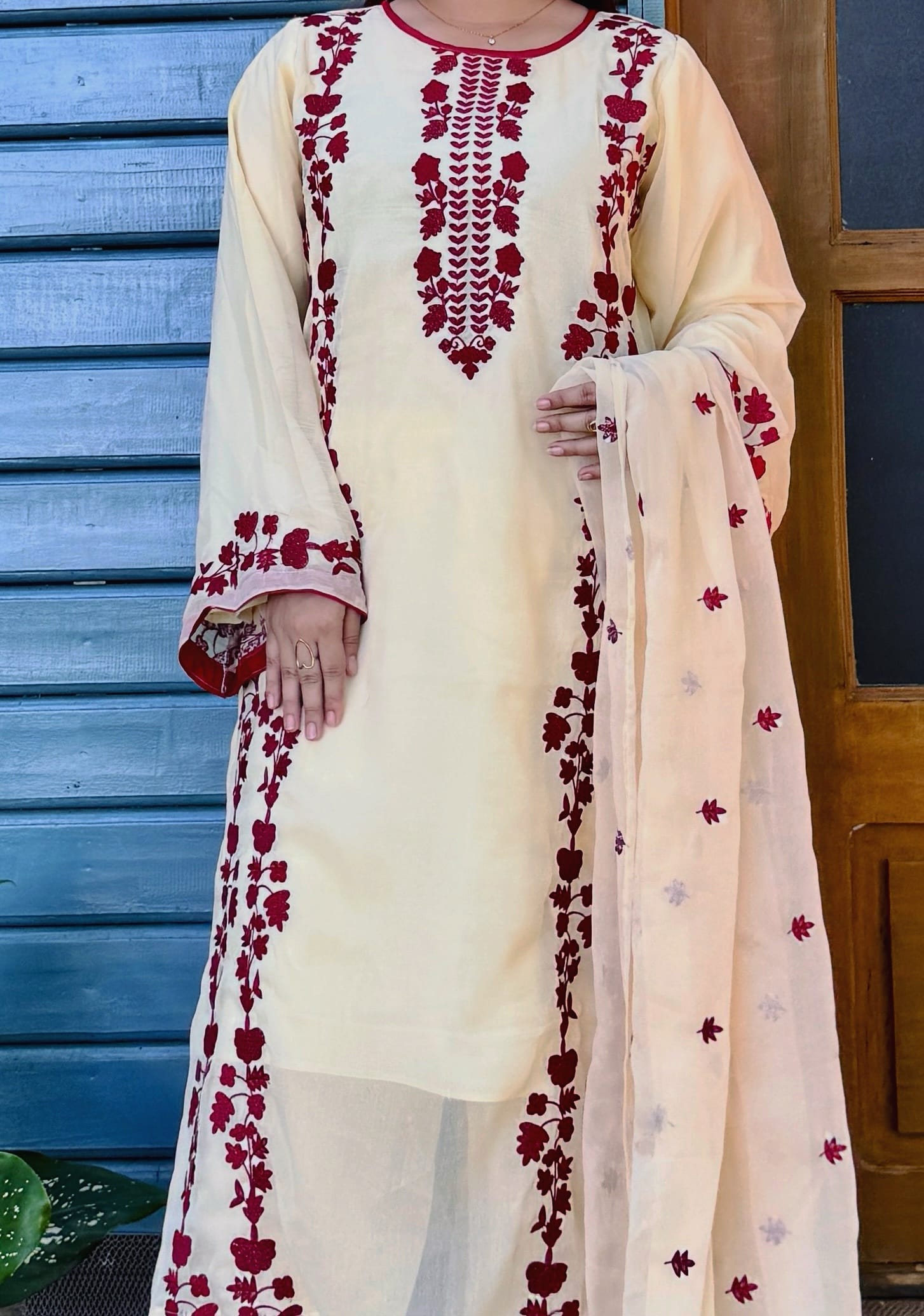 Step into timeless elegance with this exquisite 3-piece suit, beautifully adorned with intricate maroon floral embroidery on a soft cream canvas. The delicate details on the kameez, paired with a matching embroidered dupatta and flowy bottoms, bring together comfort and sophistication in one perfect outfit. Ideal for festive gatherings, family events, or casual outings – this set is designed to make you feel confident, graceful, and effortlessly stylish. A must-have for your wardrobe!